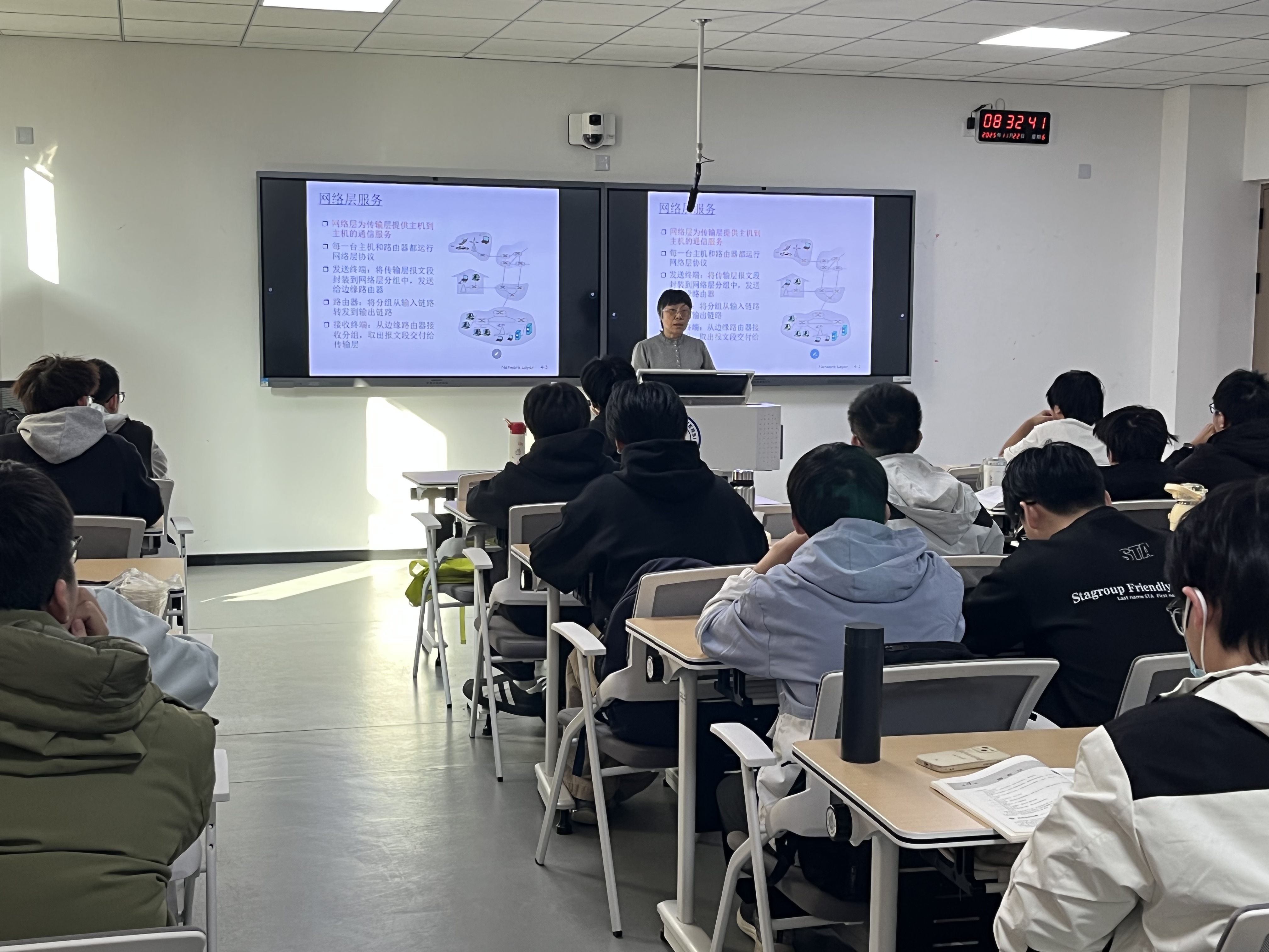 11月22日,中科大华蓓教授为2023级计算机实验班学生带来计算机网络课程的示范教学。计算机网络课程组教师冯慧斌、吴征远、吴振胤参与听课交流。